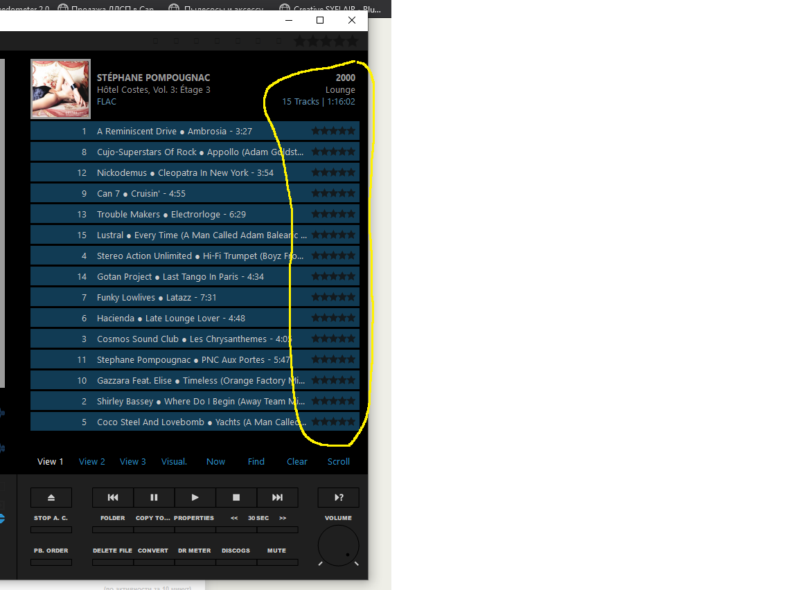 - Справа: "View 1" и "View 3" - сворачивание и разворачивание альбомов соответствующих плейлистов; "View 2" - показ и скрытие обложек в плейлисте; и "Visual." - переключение на панель "CoverFlow".
