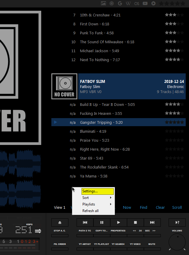 • Справа: "View 1" и "View 3" - сворачивание и разворачивание альбомов соответствующих плейлистов; "View 2" - показ и скрытие обложек в плейлисте; и "Visual." - переключение на панель "CoverFlow".