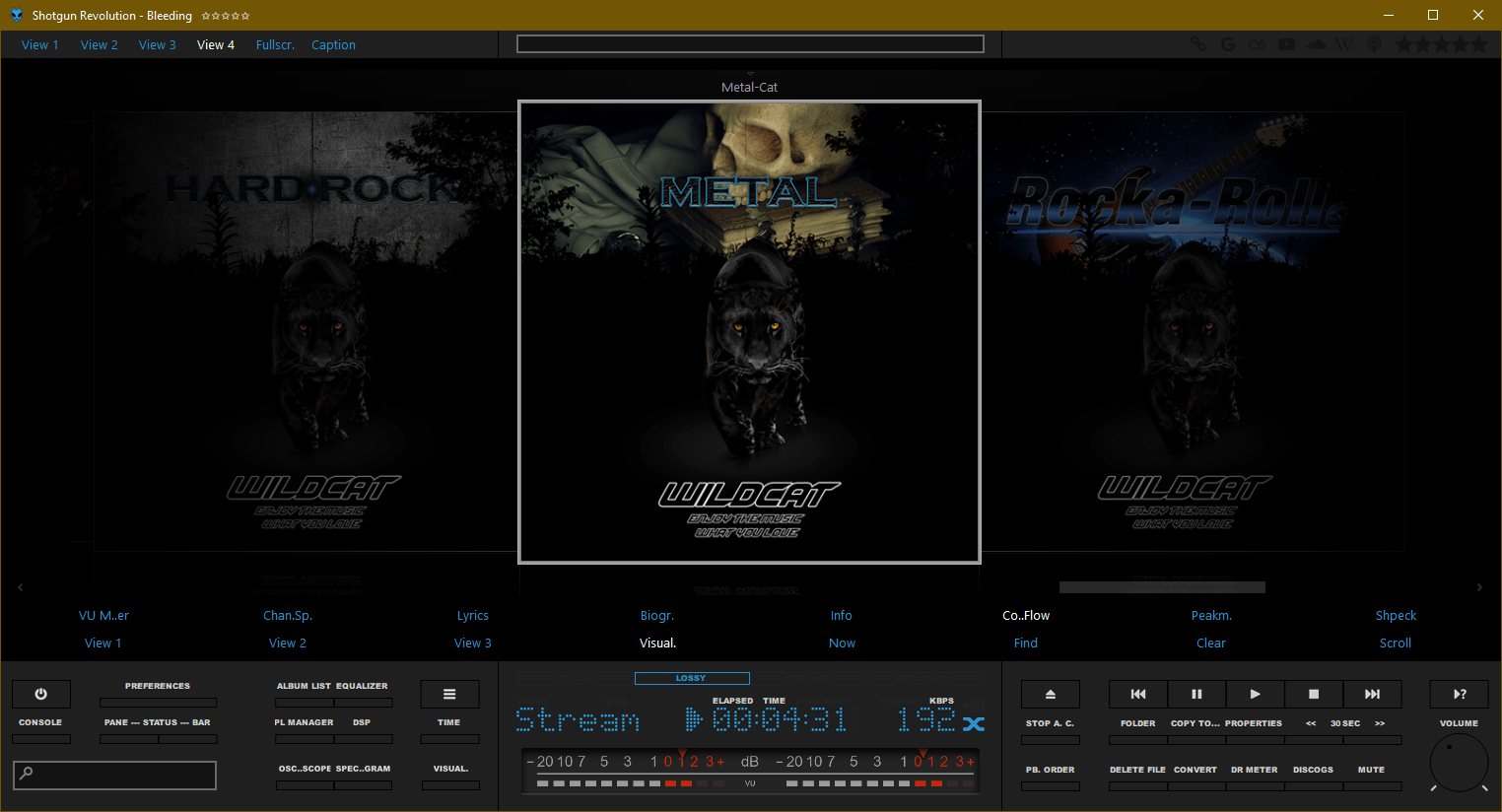 • Control Panel [средней кнопкой мыши на кнопке "OPEN" - вкл./выкл. автопереключение VU Meters в группе "Control Panel"; колесом на кнопке "OPEN" - пред./след. VU Meter в группе "Control Panel"; средней кнопкой мыши на кнопках управления воспроизведением - переключит цвет этих (и названия других) кнопок; средней кнопкой мыши на кнопке "Stop A. C." - переключит цвет названия кнопки (когда функция включена); средней кнопкой мыши на кнопке "PB. Order" - переключит её на две маленькие (пред./след.); средней кнопкой мыши на одной из дополнительных кнопок - переключит их на другие кнопки (функции)];