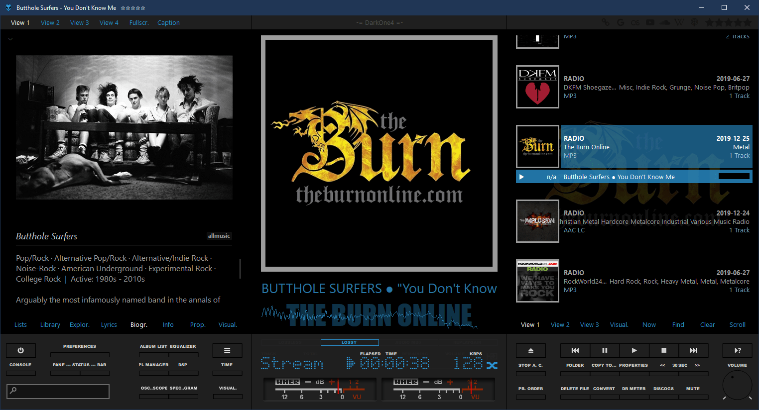 3. Справа в верхней панели расположены кнопки веб ссылок (в режиме "STOP" не активны) для поиска исполнителя на различных сайтах (Google, Last.fm, YouTube, SoundCloud, Spotify, Discogs, Wikipedia), открытия ссылки, указанной в теге %www%, и открытия URL-адреса радиостанции.