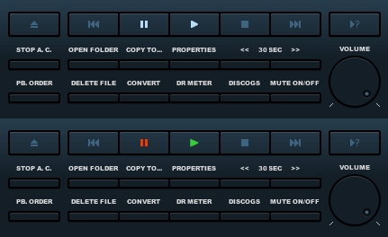 Тоже, но для DarkOne v3.1 . Там немного другая концепция, пиктограммы нарисованы на кнопках и ещё к этому кнопки меняются в зависимости от разрешения монитора(общая кнопка PlayOrPause для маленьких и две раздельные для больших), поэтому пришлось идти на компромисс, общая кнопка для Play & Pause в режиме воспроизведения светло-голубая, на паузе меняет цвет на тёмно-голубой. В меню свойства(Properties) подсветку кнопок можно отключить.