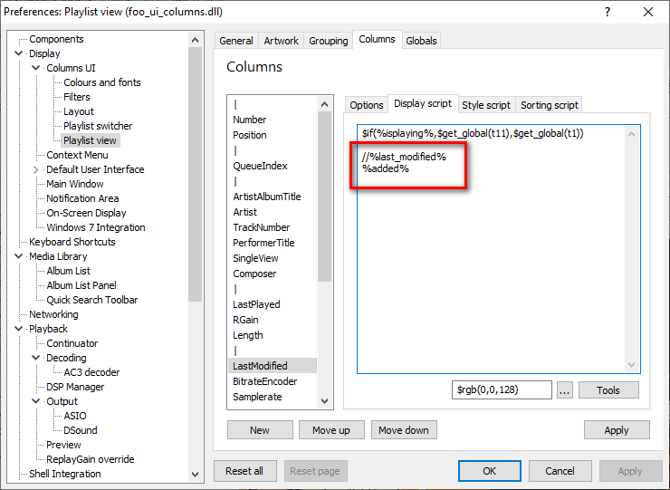 $year(%last_modified%)|'['$month(%last_modified%)']' $get(month)|$get(month) $day_of_month(%last_modified%)|[%artist% ][%date% ]["%album%"]|[%tracknumber%. ]%title%