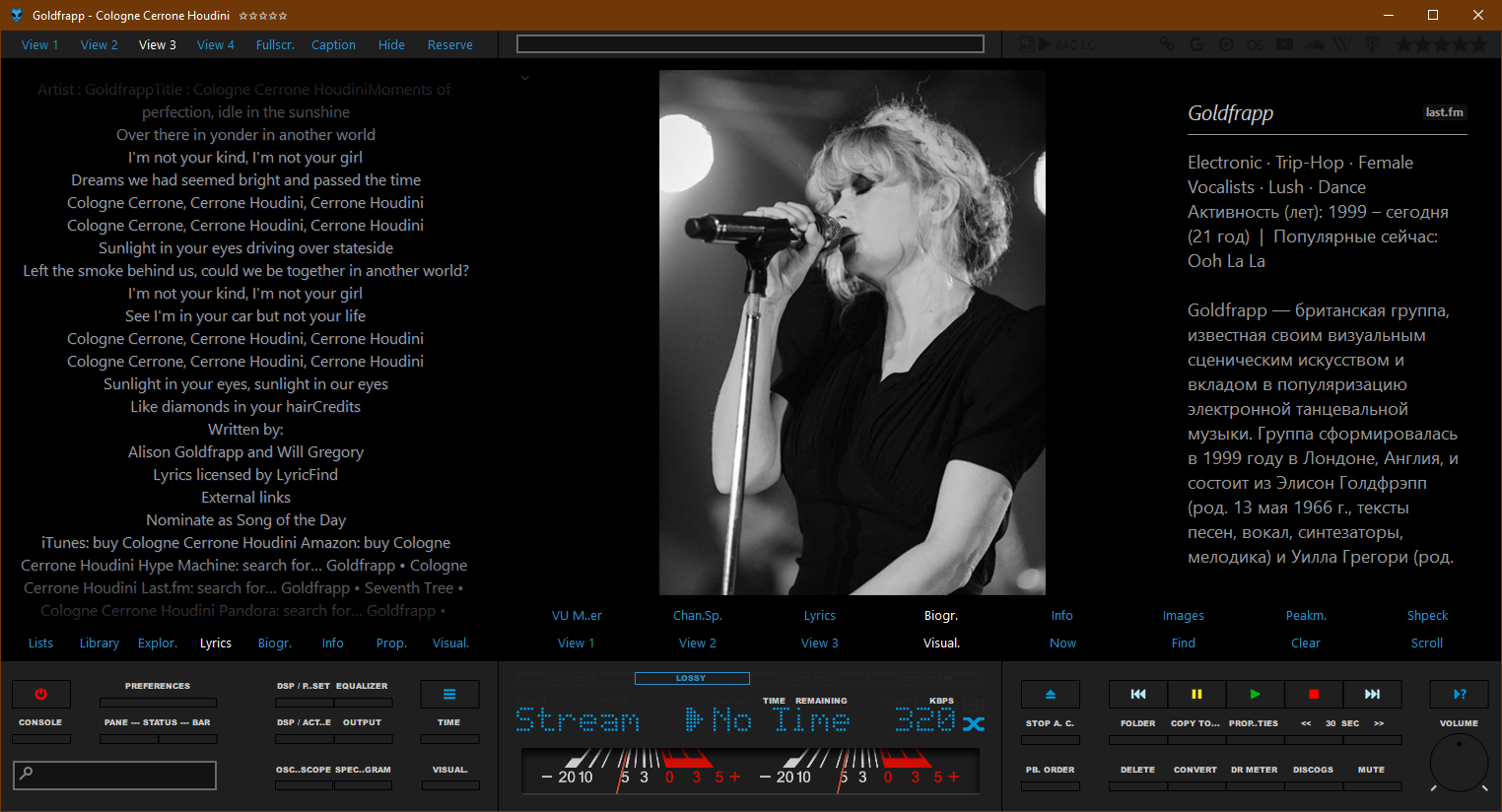 3. Справа в верхней панели расположены кнопки веб ссылок (в режиме "STOP" не активны) для поиска исполнителя на различных сайтах (Google, Last.fm, YouTube, SoundCloud, Spotify, Discogs, Wikipedia), открытия ссылки, указанной в теге %www%, и открытия URL-адреса радиостанции.