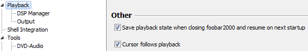 В настройках подраздел плейбэк, и поставить галочку на сохранить состояние проигрывания после закрытия фубара для запуска при последующем стартапе.