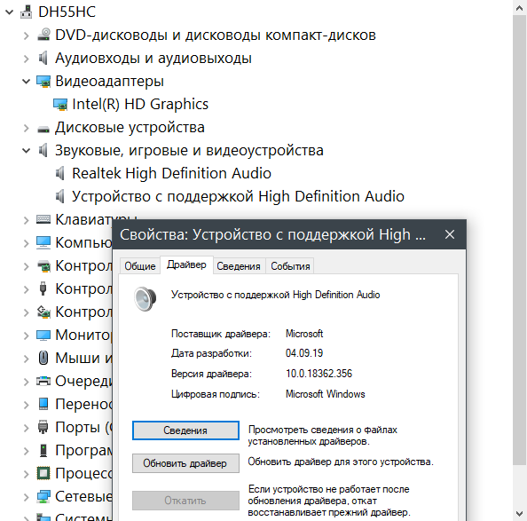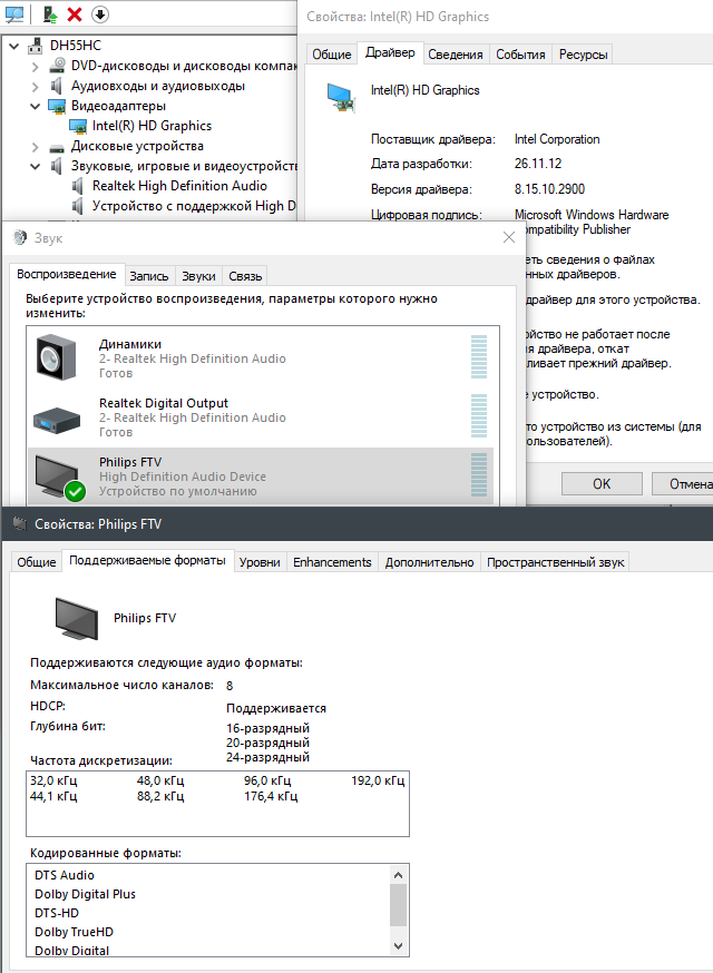 vladj:Что везде было одинаковым, так это не ставил драйвера от реалтека на эти железки. При установке драйверов на встроенное видео (от 7 до 10) в систему попутно устанавливается драйвер "Аудио Intel(R) для дисплеев", он затем виден в диспетчере устр-св.