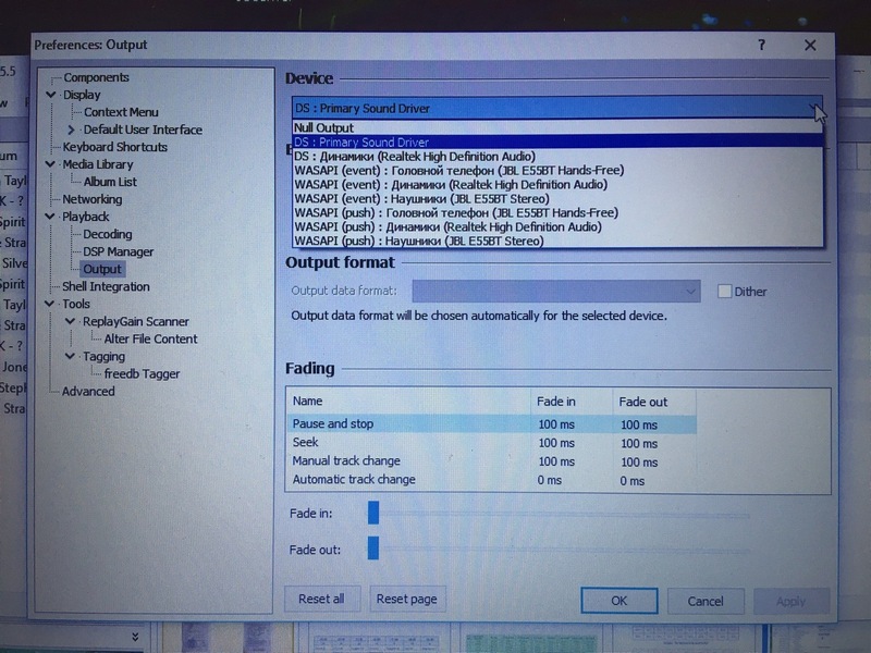 Также почитал форумы. Скачал вот отсюда http://foobar2000.org/components/view/foo_out_wasapi плагин для foobar2000, установил его в плеер. После установки плагина захожу в настройки плеера и вижу там в списке Девайсов следующие варианты: wasapi (event): Головной телефон JBL E55BT, wasapi (event): Динамики Реалтек хай дефинишн, wasapi (event): Наушники JBL E55BT Stereo, и такие же три варианта для wasapi (push):