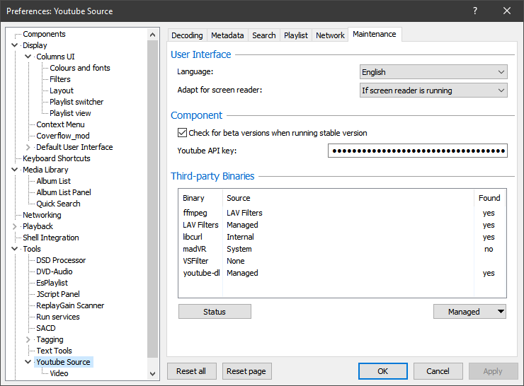 imfam, я на версии foobar2000 1.6.2 да и на любых других проблем не наблюдаю.Обновите youtube-dl.exe до последней версии 2021.01.08,для лёгкого обновления в настройках должно стоять Managet.Если не поможет сделайте сброс настроек во всех вкладках кроме последней Maintenance по умолчанию.