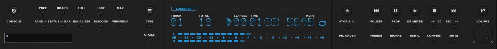 - Control Panel [средней кнопкой мыши на кнопке "OPEN" - вкл./выкл. автопереключение VU Meters в группе "Control Panel"; колесом на кнопке "OPEN" - пред./след. VU Meter в группе "Control Panel"; средней кнопкой мыши на кнопках управления воспроизведением - переключит цвет этих (и названия других) кнопок; средней кнопкой мыши на кнопке "Stop A. C." - переключит цвет названия кнопки (когда функция включена); средней кнопкой мыши на кнопке "PB. Order" - переключит её на две маленькие (пред./след.); средней кнопкой мыши на одной из дополнительных кнопок - переключит их на другие кнопки (функции)];
