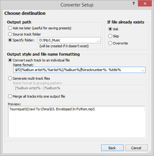 Но чтобы их перекодировать надо по отдельности кидать каждый альбом в плейлист и отдельно каждому указывать свой путь. Получается довольно долго. Есть ли способы как-то упростить себе жизнь? Сделать конвертацию с сохранением пути исходного файла, но начало пути заменить с d:\Music на d:\Mp3_Music