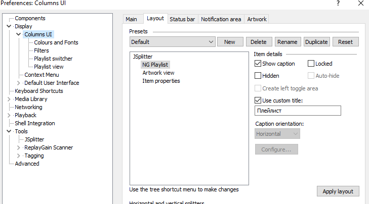 2. Поддерживается режим редактирования разметки как в DUI так и в CUI в традиционной для них манере. Поддерживается также управление размещением панелей в сплиттере через стандартный "размещатель" Columns UI.
