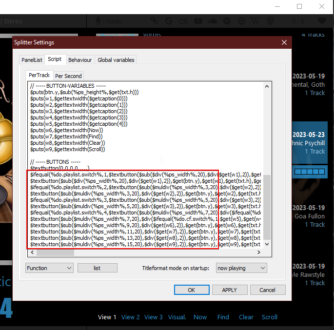 - В панели "Lists" можно выбрать различные виды отображения. Для выбора желаемого вида нужно зайти в настройки "Preferences\Display\Columns UI\Playlist switcher -> Use title formatting for playlist titles:" и поменять значения view, lock, data и separator.