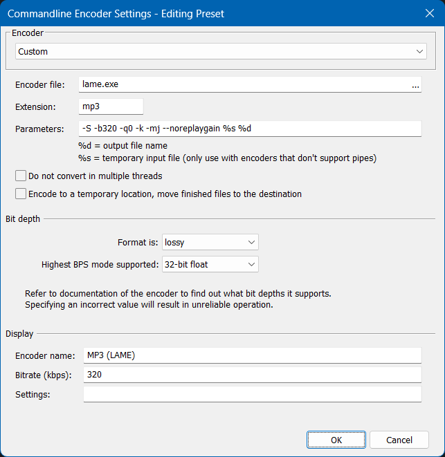 -S -b320 -q0 -k -mj --noreplaygain %s %dВозможно, я не специалист. Использую данные параметры уже много лет. Хотя в последнее время кодирую в Musepack (для машины).Azaza:в версии 3.100 ключ -k вообще не работает