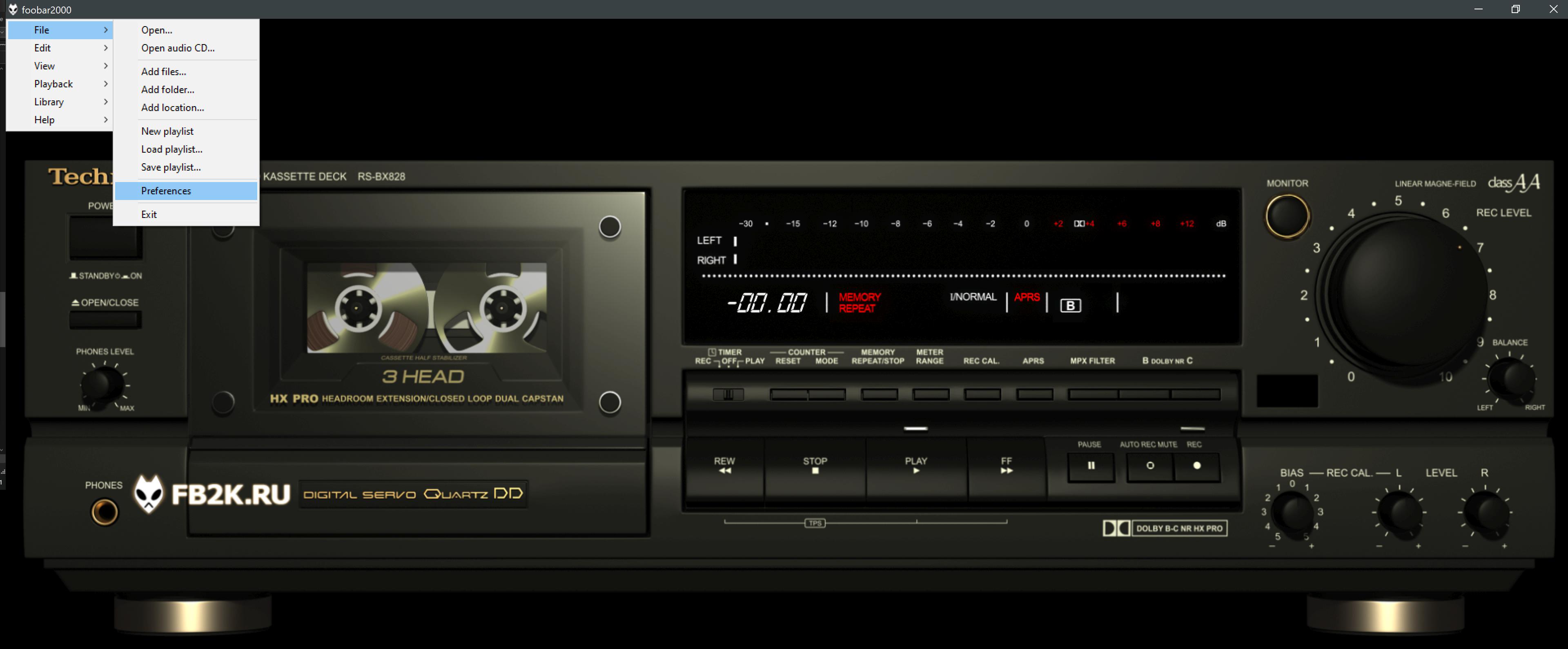 Настройки foobar2000 доступны через кнопку 2, см. скриншот с меню.