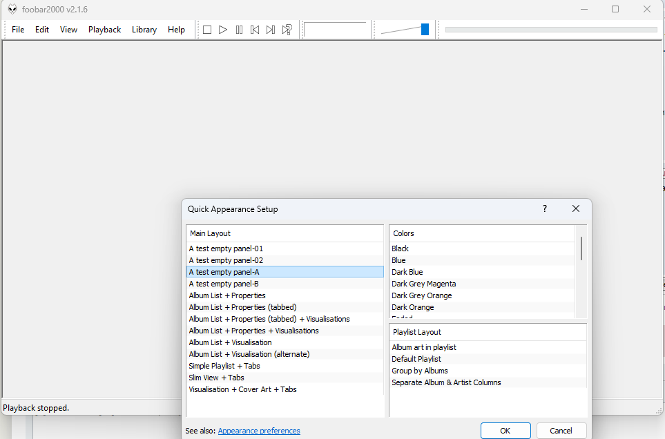 1. Панели добавляются в сплиттер в произвольном порядке, где с ними можно работать как с обычными окнами Windows, а именно: перемещать, изменять их размер, сворачивать, разворачивать, закрывать. Т.е. при работе с плагином foobar2000 превращается в приложение с MDI интерфейсом (Multi Document Interface). Для точного позиционирования панелей предусмотрено отображение координат и их редактирование "на лету" в заголовке окна панели (полезно при дизайне интерфейса сборки). Также имеется возможность настраивать цвета и шрифт заголовка окон панелей.