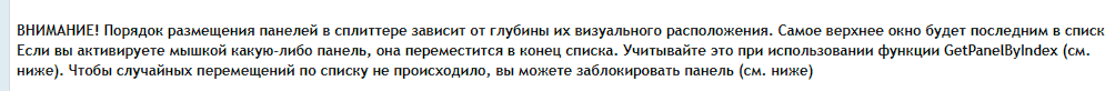 ВНИМАНИЕ! Порядок размещения панелей в сплиттере зависит от глубины их визуального расположения. Самое верхнее окно будет последним в списке. Если вы активируете мышкой какую-либо панель, она переместится в конец списка. Учитывайте это при использовании функции GetPanelByIndex (см. ниже). Чтобы случайных перемещений по списку не происходило, вы можете заблокировать панель (см. ниже)