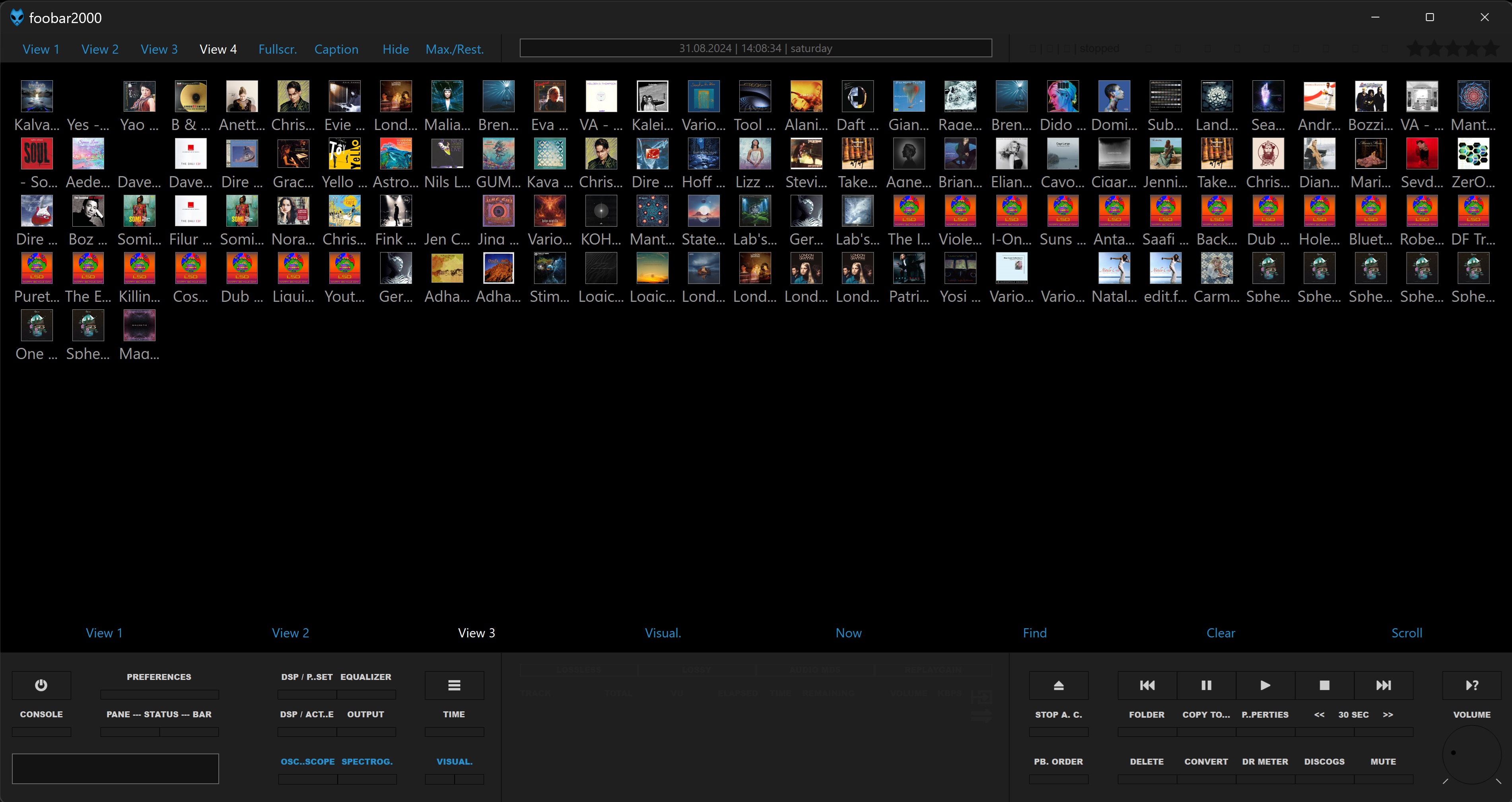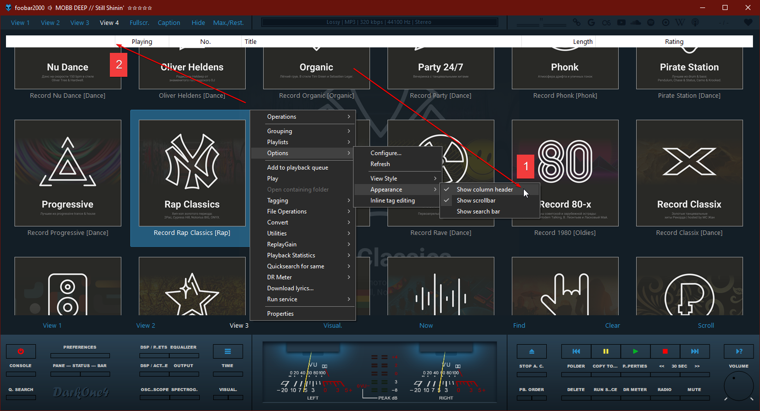 - Справа: "View 1" и "View 3" - сворачивание и разворачивание альбомов соответствующих плейлистов; "View 2" - показ и скрытие обложек в плейлисте; и "Visual." - переключение на панель "CoverFlow".