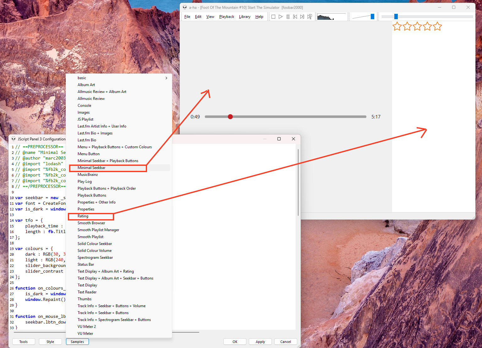 Если у Вас или может быть у кого то еще есть свободное время уделить пару минут.Прошу Вас скиньте сюда какой-то полезный скрипт для панели foo_jscript_panel3-3.8.5 я просто замучил ИИ. и так ничего и не сделал.Элементарно хотябы рейтинг воспроизводимого трека или ползунок громкости или скрипт чтоб открывал текст вшитий в mp3.