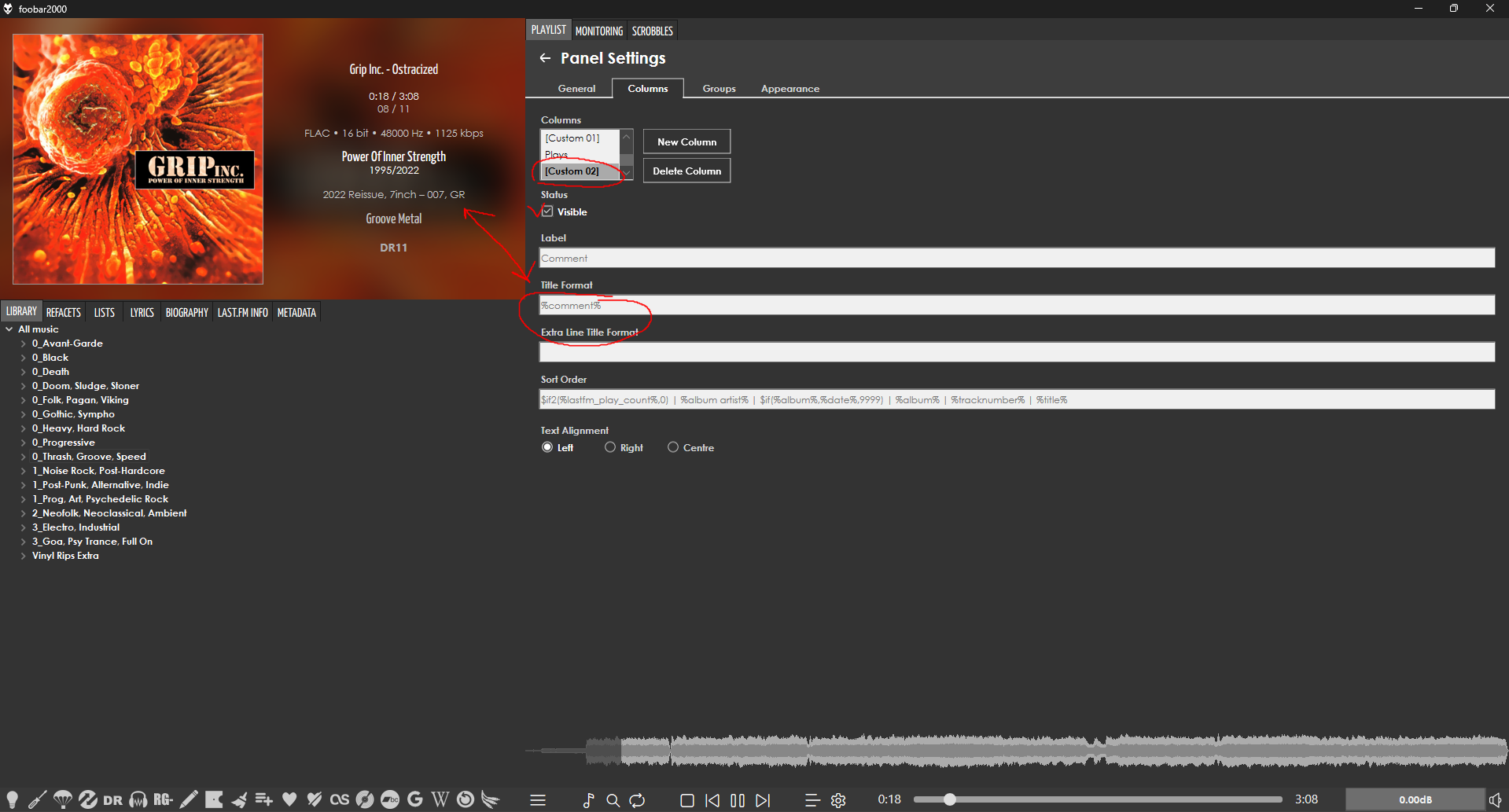 К слову, в Jscript Panel 3 есть JS Playlist, весьма неплохо настраиваемый, так вот в нем можно кастомный столбец сделать, прописав значение $meta(comment) или %comment%, естественно значение пропишется напротив каждого трека в плейлисте. Но я это использую для сэмпла Text Display.