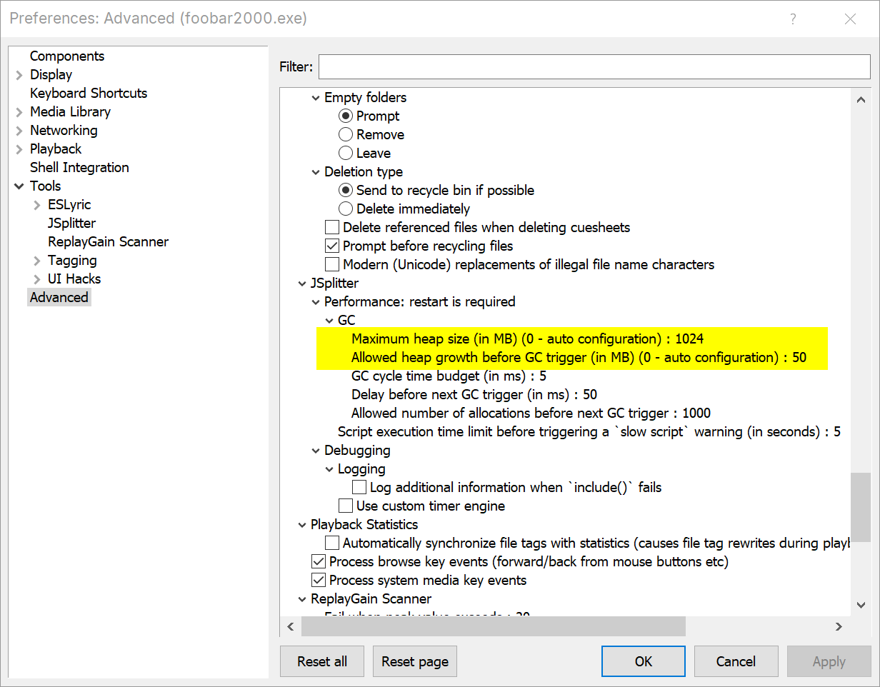 Hi LUR, due to default setting of JSPlitter memory limit, when initially caching the covers of a big library, e.g. 60K+ tracks, it will easily reach the limit and result in crash.