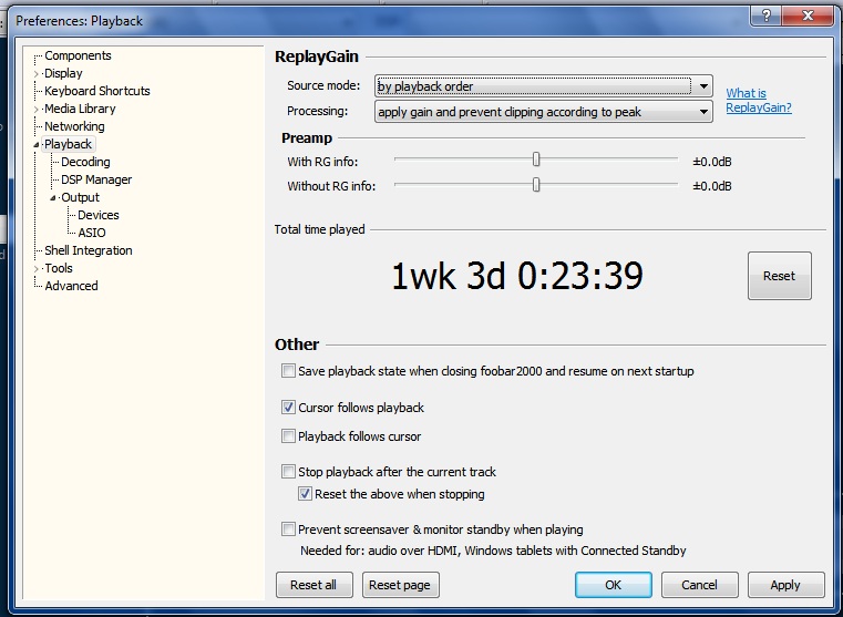При установке значения Preamp -> With RG info на +5 получал результат, которого и добивался: на дисплее деки уровень входящего сигнала от каждого воспроизводимого в foobar2000 трека поучился практически одинаковым и громкость их всех тоже была на слух одинаковой :clap: Но вот со звуком появились большие проблемы - на высоких частотах уже были слышны искажения :sad:
