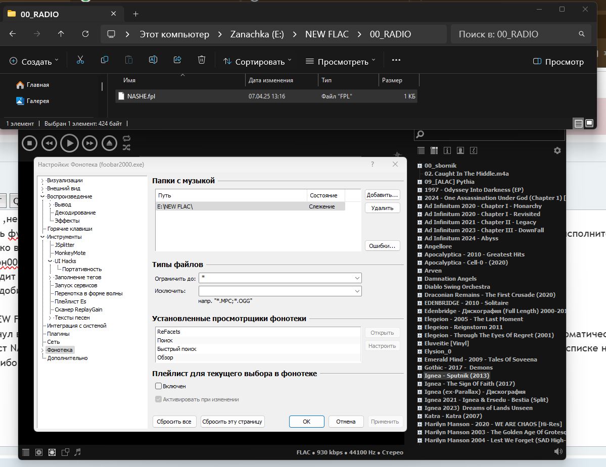 создал папку в e:\NEW FLAC\ под названием "00_RADIO" что бы она была вверху списка моей фонотеки (которой я пользуюсь в папочном представлении ) кинул в эту папку плейлист ... но лыжи не едут , я хочу ткнуть справа в виде папок по папке 00_RADIO от туда пусть автоматически запуститься плейлист NASHE.fpl и играет ,надоест ,ткну другую папочку где уже композиции flac или cue формата , но папка 00_RADIO в списке не отображается , спасибо .