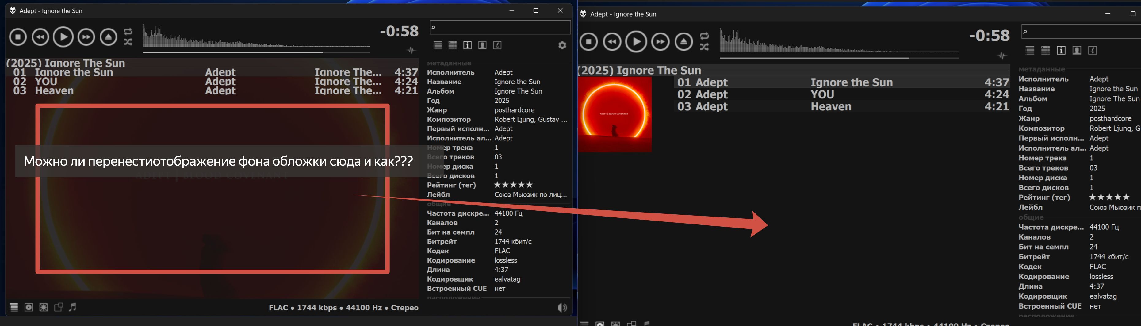 1) "Плоский" режим с фоновой обложкой - это просто список треков с разделением по альбомам или по папкам (если прилетели из Проводника)