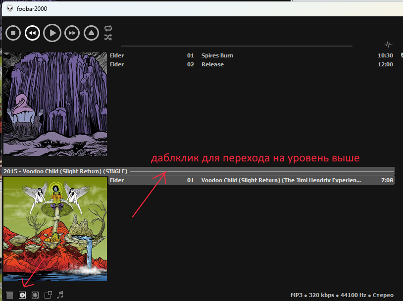 2) Плейлист с "папкообразной навигацией" - это многоуровневый плейлист, по нему можно бродить как по папкам. Двойной клик на заголовке альбома - переход наверх.