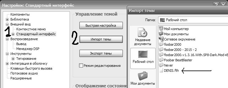 Файл - Настройки- Стандартный интерфейс - Импорт темы (DENIS.fth или DENIS 2.fth) - Открыть - Ок