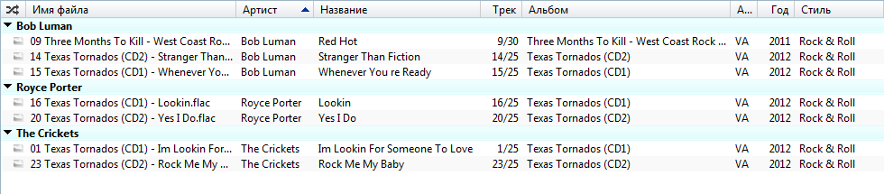 Четвертый. Сгруппировал в одну группу (Group format: - пусто, Sort format: %tracknumber% - %title%). Скрипт отработал правильно, проверяя теги: