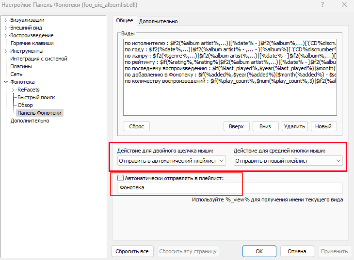 Все, что накликаете (любую ветку в Фонотеке) автоматом будет в плейлисте Фонотека, в настройках видно имя автоплейлиста. Одиночный клик это галочка "Автоматически отправлять в плейлист" (отключил по умолчанию), для двойного клика и средней кнопки мыши соответственные настройки увидите.