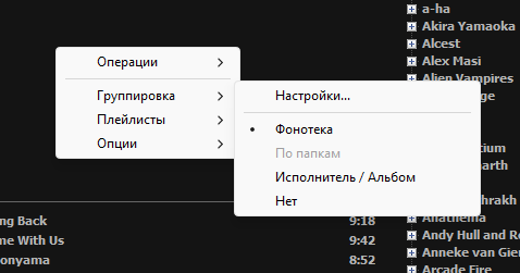1) "Плоский" режим с фоновой обложкой - это просто список треков с разделением по альбомам или по папкам (если прилетели из Проводника)