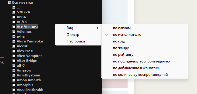 Почитал ОЧЕНЬ внимательно, но ничего по данному вопросу там нет. Катастрофически неудобное отображение: если сортирует по исполнителю, то автоматом пихает к имени и альбомы и год, скрывая под спойлер всё нужное, включая другие композиции, если сортировка по папкам, то не отображает продолжительность, а слева всё убирает, оставляя одну проигрываемую композицию, которая не переключается автоматически и играет по кругу...