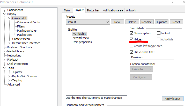 Hide panels on close - скрывать окна вместо их закрытия. Полезно для временного скрытия панели с помощью кнопки закрытия окна. Вернуть обратно окна можно в размещателе Columns UI сняв галочку Hidden с панели (или из "списка панелей" см. выше):