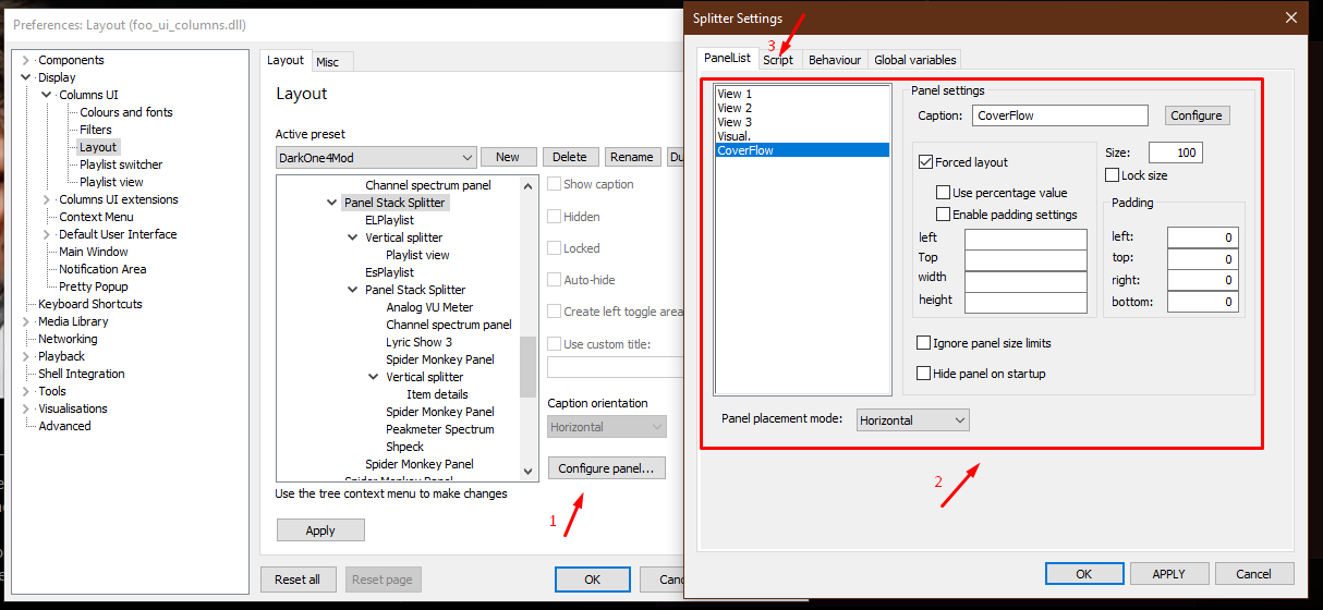 - Размер шрифта в Columns UI можно изменить (из-за несовместимости с компонентом "UI Hacks") только обходным путём, временно отключив компонент "foo_ui_hacks". Переименуйте папку компонента "foo_ui_hacks" в "_foo_ui_hacks", измените размер шрифта на нужный, затем снова измените имя папки на "foo_ui_hacks".
