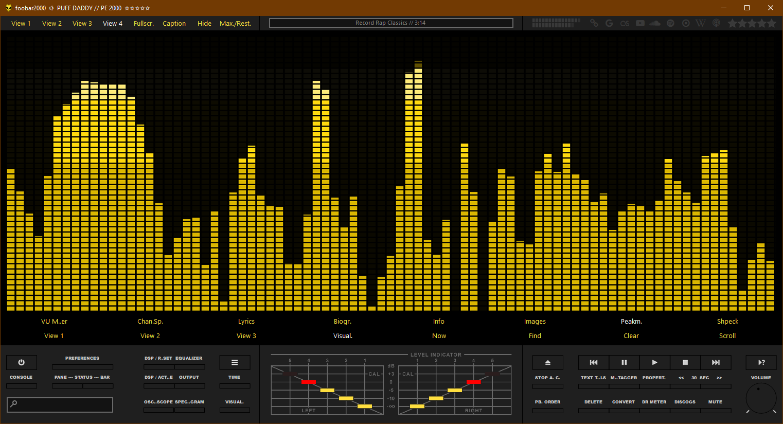 - Control Panel [средней кнопкой мыши на кнопке "OPEN" - вкл./выкл. автопереключение VU Meters в группе "Control Panel"; колесом на кнопке "OPEN" - пред./след. VU Meter в группе "Control Panel"; средней кнопкой мыши на кнопках управления воспроизведением - переключит цвет этих (и названия других) кнопок; средней кнопкой мыши на кнопке "Stop A. C." - переключит цвет названия кнопки (когда функция включена); средней кнопкой мыши на кнопке "PB. Order" - переключит её на две маленькие (пред./след.); средней кнопкой мыши на одной из дополнительных кнопок - переключит их на другие кнопки (функции)];
