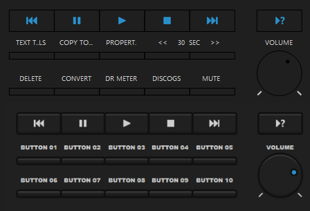 • Control Panel [средней кнопкой мыши на кнопке "OPEN" - вкл./выкл. автопереключение VU Meters в группе "Control Panel"; колесом на кнопке "OPEN" - пред./след. VU Meter в группе "Control Panel"; средней кнопкой мыши на кнопках управления воспроизведением - переключит цвет этих (и названия других) кнопок; средней кнопкой мыши на кнопке "Stop A. C." - переключит цвет названия кнопки (когда функция включена); средней кнопкой мыши на кнопке "PB. Order" - переключит её на две маленькие (пред./след.); средней кнопкой мыши на одной из дополнительных кнопок - переключит их на другие кнопки (функции)];