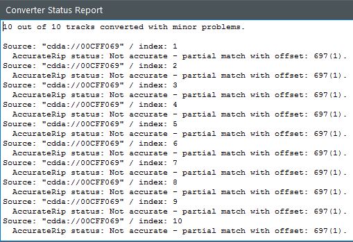 Cerberus, треки не проходят проверку в сервисе AccurateRip. Вероятная причина - Ваш привод использует offset в 697. Тогда, как в базе сервиса эти треки зафиксированы с другим смещением.