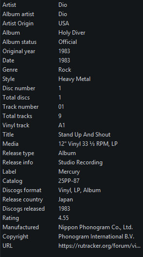 NikosColev, Нужно что бы изначально artist и album были прописаны корректно это можно поправить вручную тогда на Discogs найдётся точно. Если не получается никакой вариант, тогда можно найти релиз при помощи браузера на сайте Discogs и вручную вписать в тег DISCOGS_RELEASE_ID номер релиза [r4399825] - только цифры без скобок и r. И уже тогда через плагин автоматом прописать теги. Но это в редком случае когда Various например как этот ваш релиз а так в основном всё находит.
