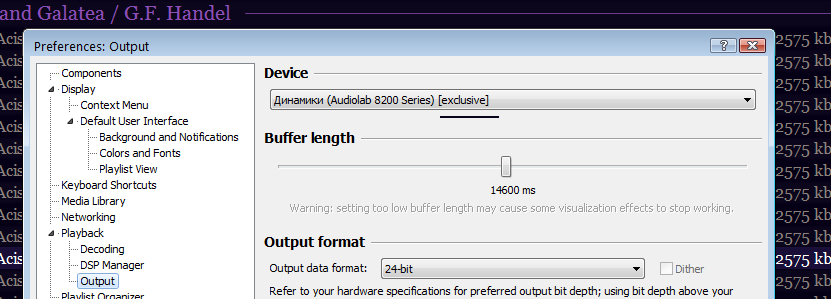 Средний параметр задает значение буфера в ms, однако, почему-то, в моем случае, увеличение буфера даже до больших значений не приводит к "заторможенности анимации" спектроанализаторов, как это всегда было при использовании старого компонента wasapi exclusive; при использовании ASIO, при максимальном буфере в 50 ms, тоже есть "заторможенности анимации", а тут сколько ни поставь - нету тормозов.