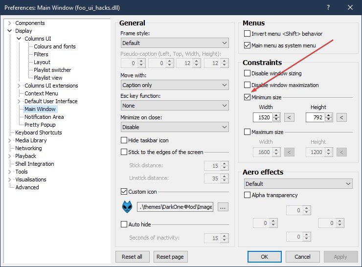 - Размер шрифта в Columns UI можно изменить (из-за несовместимости с компонентом "UI Hacks") только обходным путём, временно отключив компонент "foo_ui_hacks". Переименуйте папку компонента "foo_ui_hacks" в "_foo_ui_hacks", измените размер шрифта на нужный, затем снова измените имя папки на "foo_ui_hacks".