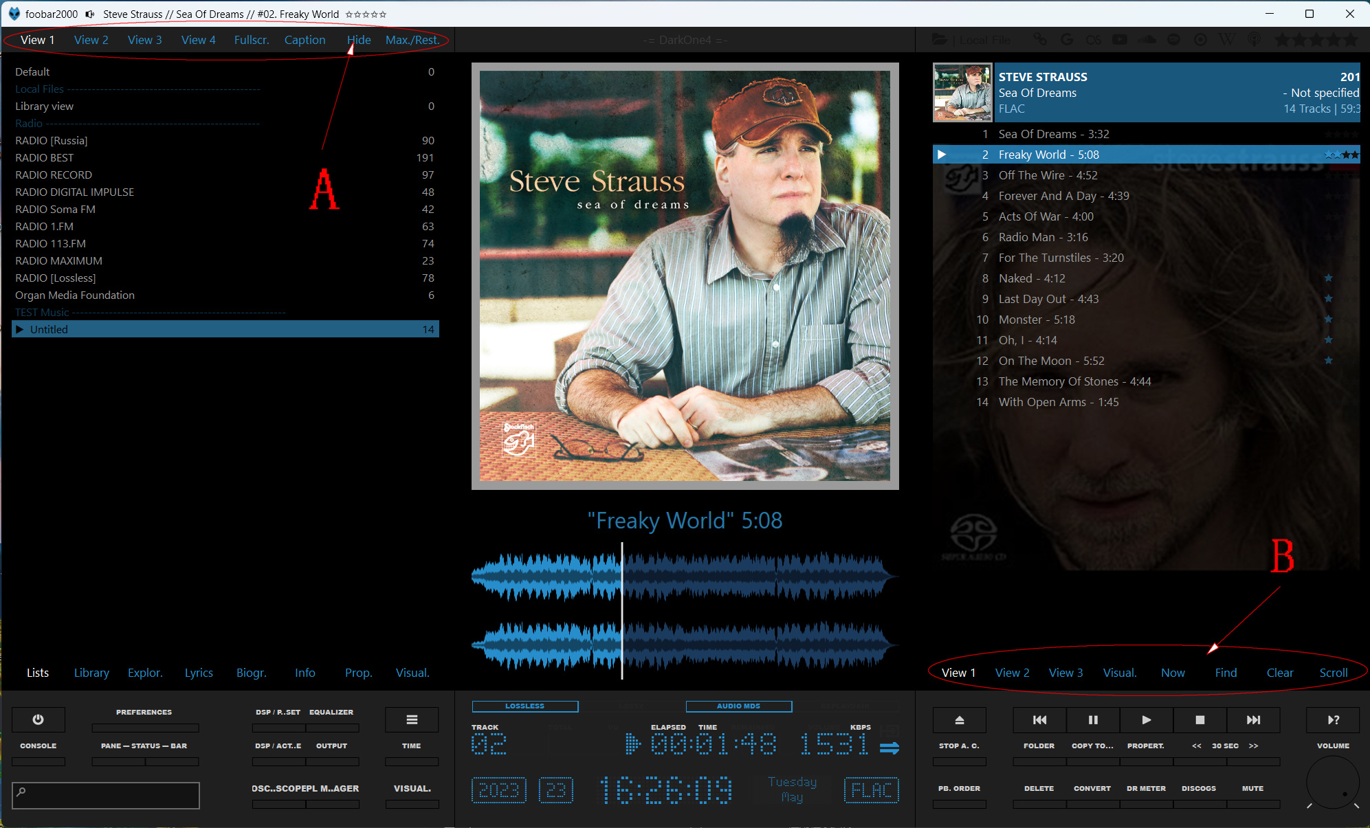 - Справа: "View 1" и "View 3" - сворачивание и разворачивание альбомов соответствующих плейлистов; "View 2" - показ и скрытие обложек в плейлисте; и "Visual." - переключение на панель "CoverFlow".