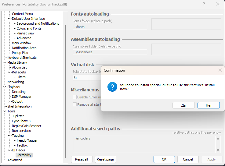 В новых версиях dll для portability не хочет устанавливаться. Я правильно понимаю, что без этого компонента вот такие пути теперь не работают .\foo\bar\%2000%\%foobar2000%_*.* ? Можно ли как-то по-другому ссылаться на корневой каталог foobar без необходимости указывать полный путь? Может переменная вроде такой существует %root%\foo\bar\%2000%\%foobar2000%_*.* ?
