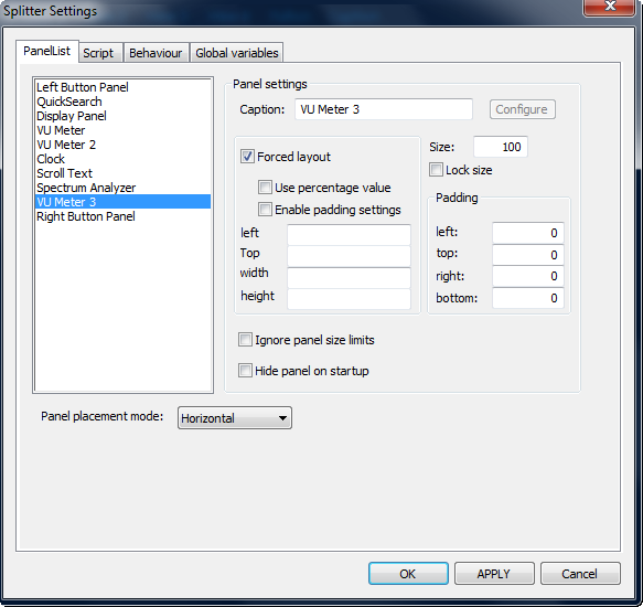 - Control Panel [средней кнопкой мыши на кнопке "OPEN" - вкл./выкл. автопереключение VU Meters в группе "Control Panel"; колесом на кнопке "OPEN" - пред./след. VU Meter в группе "Control Panel"; средней кнопкой мыши на кнопках управления воспроизведением - переключит цвет этих (и названия других) кнопок; средней кнопкой мыши на кнопке "Stop A. C." - переключит цвет названия кнопки (когда функция включена); средней кнопкой мыши на кнопке "PB. Order" - переключит её на две маленькие (пред./след.); средней кнопкой мыши на одной из дополнительных кнопок - переключит их на другие кнопки (функции)];