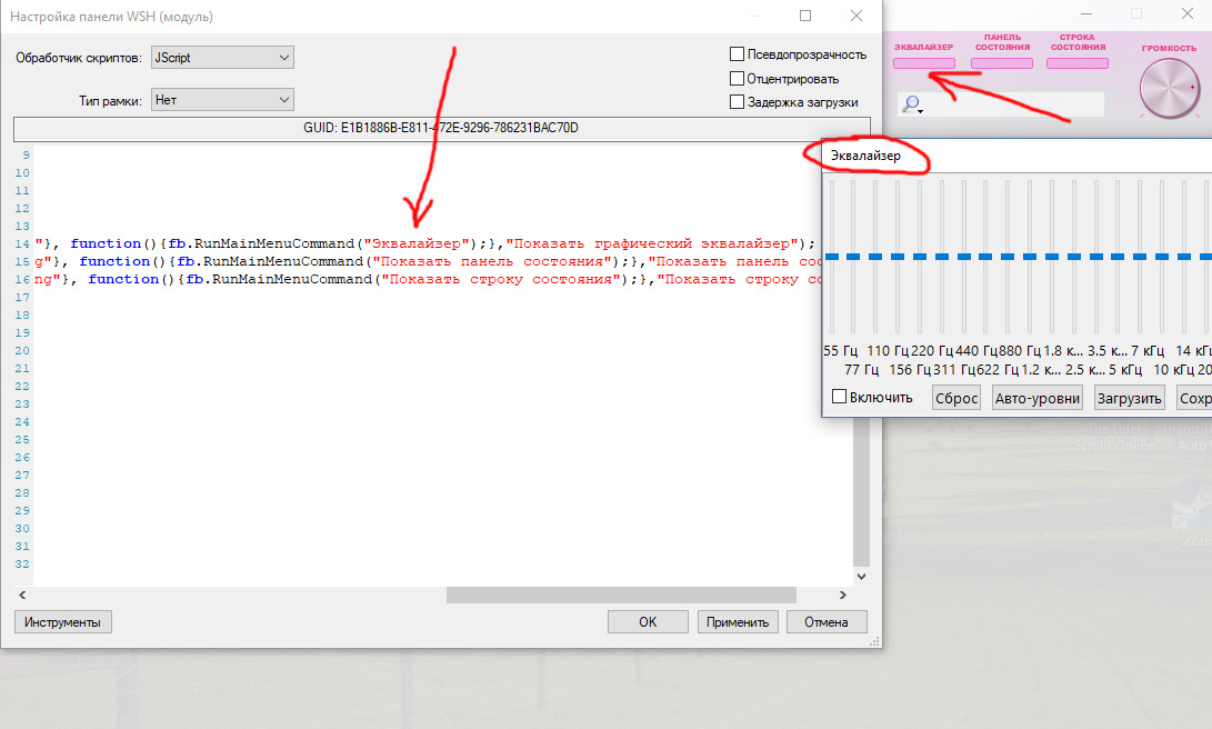 Примечания: 1. При использовании штатного эквалайзера, вызов его на экран кнопкой DSP на панели, вызовет "крэш" плеера. Что обусловлено особенностью эквалайзера или плагина foo_vst.