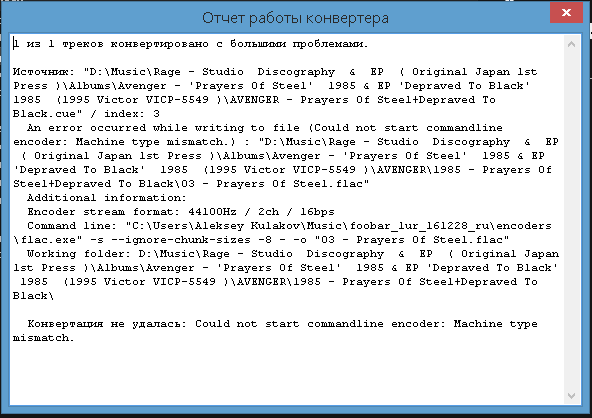 Сборка foobar_lur_161228_ru, сначала обновил старую - не конвертирует. Усановил начисто. тот же эффект. Win 8.1 x86 Professional