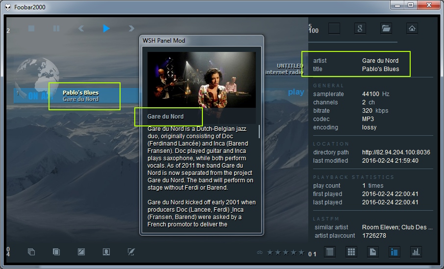 при прослушивании треков и переключении интернет-радиостанций работает как положено. Но если слушать одну станцию, при смене исполнителя (на этой же станции) не происходит переход на биографию нового исполнителя, отображается предыдущий...