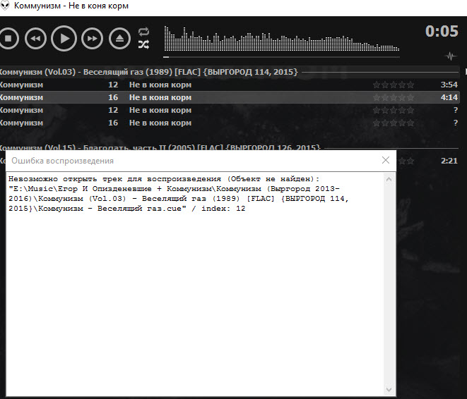 Запустил плеер от имени Администратора, добавил в фонотеку папки с музыкой. Начинается воспроизведение, спустя какое-то время плеер виснет с ошибкой