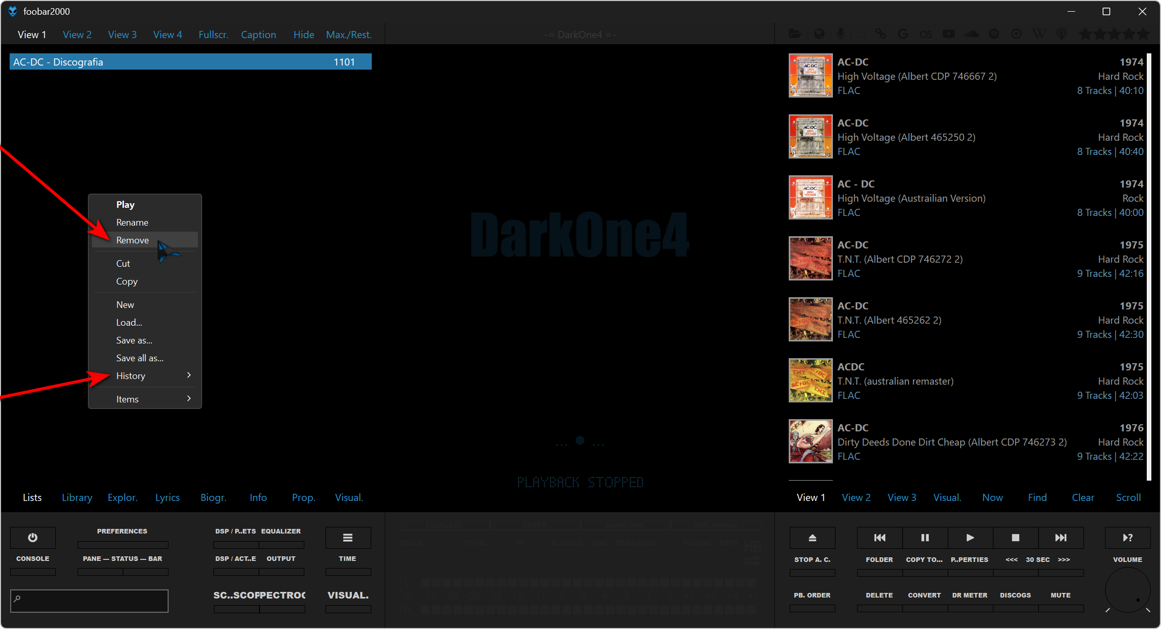 - В панели "Lists" можно выбрать различные виды отображения. Для выбора желаемого вида нужно зайти в настройки "Preferences\Display\Columns UI\Playlist switcher -> Use title formatting for playlist titles:" и поменять значения view, lock, data и separator.