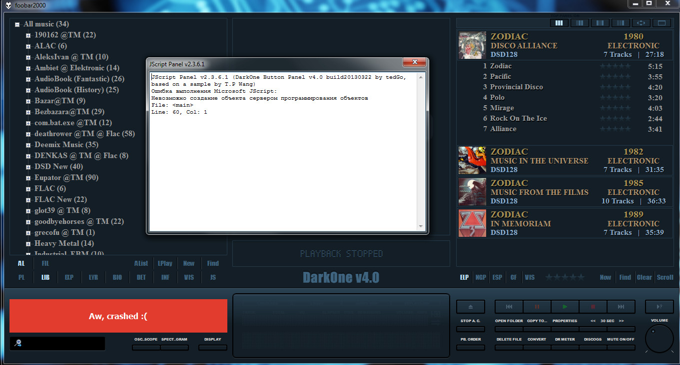 DarkOne_4_JS_v1.5.8_final Версия плеера 1.5.8 final, версия JScript Panel v2.3.6.1 by marc2003 - kbuffington (foo_jscript_panel.dll), Columns UI 0.5.1 (foo_ui_columns.dll). Системные требования WIN 7 и выше.