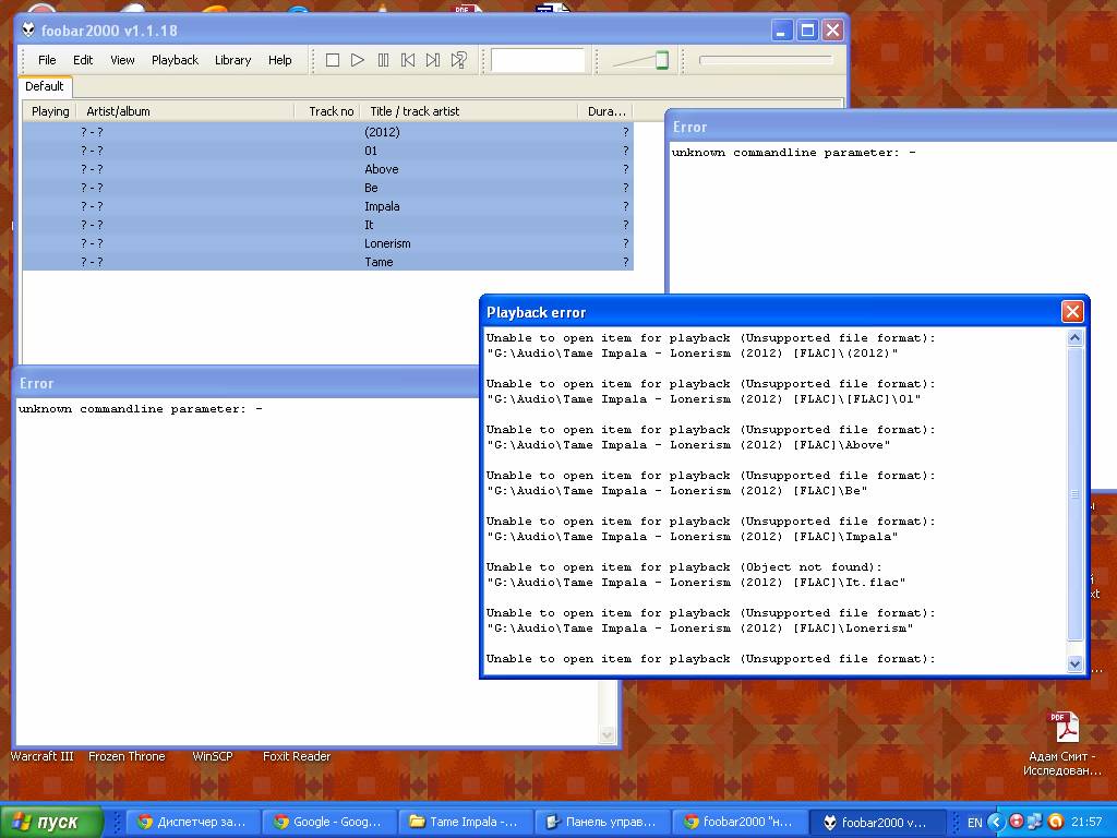 Здравствуйте, у меня такая проблема: при открытии файлов flac и mp3 щелчком происходит ошибка "Unable to open item for playback (Unsupported file format):", при этом при перетаскивании файла в плейлист открытого foobar'а все работает нормально, cue файлы тоже открываются нормально. Не понимаю из-за чего это происходит.
